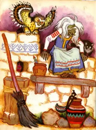 В волшебных сказках она действует в трех воплощениях. Яга-богатырша обладает мечом - кладенцом и на равных бьется с богатырями. Яга-похитительница крадет детей, иногда бросая их, уже мертвых, на крышу родного дома, но чаще всего, унося в свою избушку на курьих ножках, или в чистое поле, или под землю. Из этой диковинной избы дети, да и взрослые, спасаются, перехитрив Ягибишну. И, наконец, Яга-дарительница приветливо встречает героя или героиню, вкусно угощает, парит в баньке, дает полезные советы, вручает коня или богатые дары, например, волшебный клубок, ведущий к чудесной цели, и т.д.