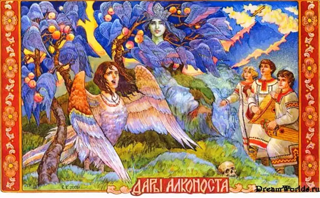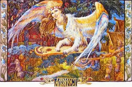 АЛКОНОСТ - Райская светлая птица-дева с человеческим лицом, управляет погодой, птица бога Хорса (бог солнца в слав. мифологии) У Алконоста есть волшебные свойства. Например, на те 7 дней, во время которых Алконост высиживает яйца, и еще неделю, пока выкармливает птенцов, устанавливается спокойная погода, бури сменяются легким ветром. Но самая главная особенность Алконоста - его чудесное, завораживающее пение. Подпись под одной из лубочных картиной гласит: "Алконост близ рая пребывает, иногда и на Ефрате-реке бывает. Когда в пении глас испущает, тогда и самое себя не ощущает. А кто в близи тогда будет тот все на свете забудет: тогда ум от него отходит, и душа из тела выходит." Алконост считалась символом светлой печали. Сравниться с Алконостом в сладкозвучии может лишь птица Сирин. Изображали Алконост-птицу с руками, крыльями и короной на голове.