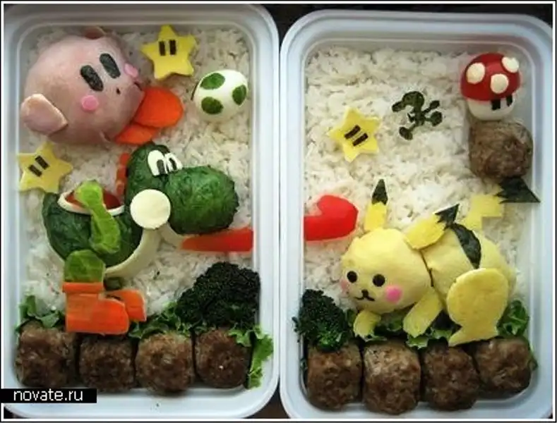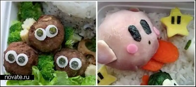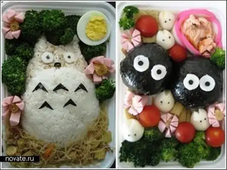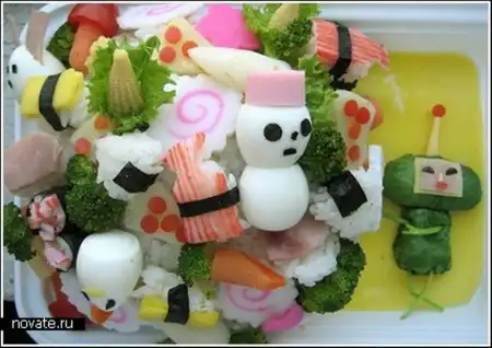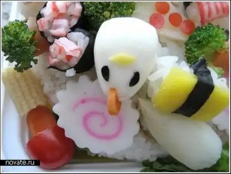 Все эти творения принадлежат японке с никнеймом Anna The Red. Девушка ведет свой блог в интернете, где рассказывает подробно о приготовлении каждого из блюд, так что если что-то уж очень понравится, думаю, можно сделать домочадцам подарок. Интересно, что использует она для этого не только сырую рыбу и рис, но еще и картофель, яйца, мясо, очень многие виды овощей и фруктов и еще море всяких вкусностей. Оттого эти чудеса получаются не просто крайне красивыми по исполнению, но и разнообразными. Ведь если каждый раз есть суши, это быстро надоест, а здесь – и гарниры, и десерты, и салаты
