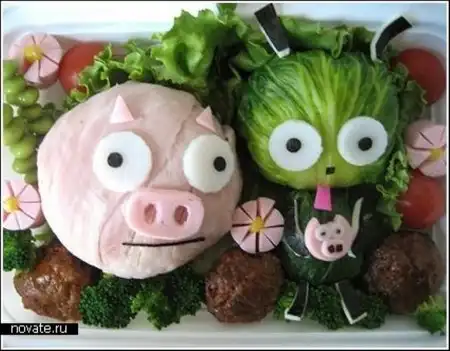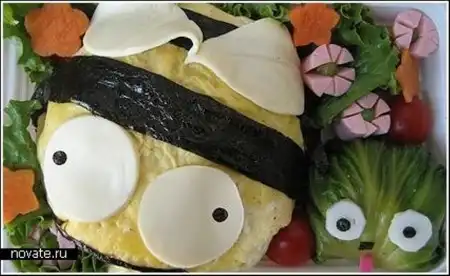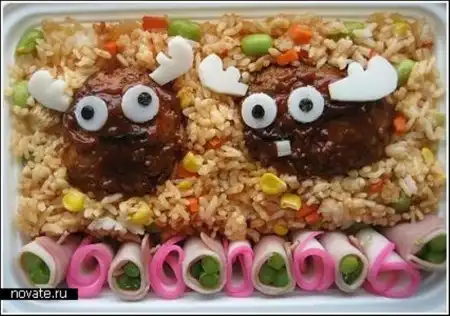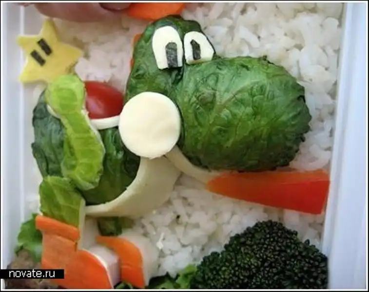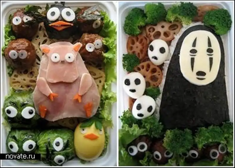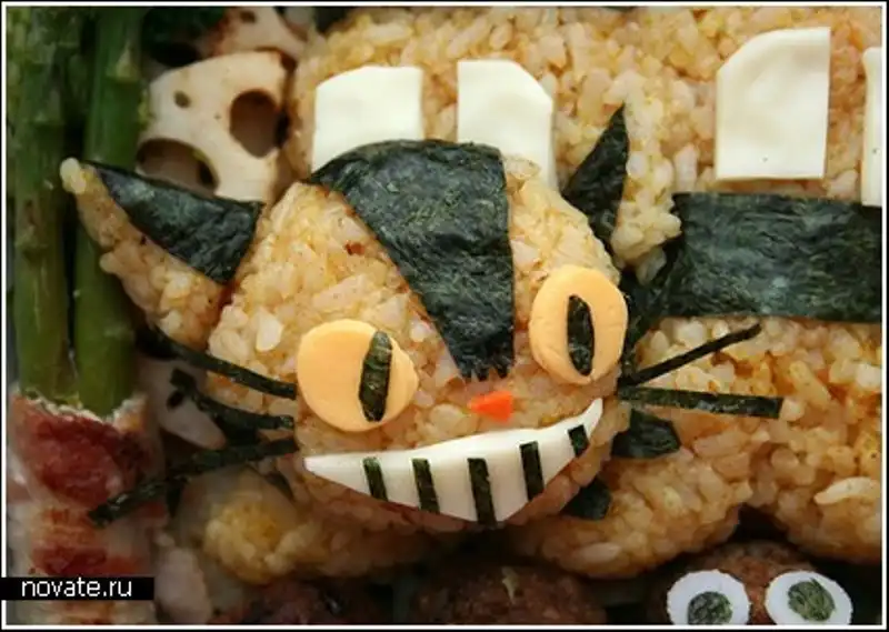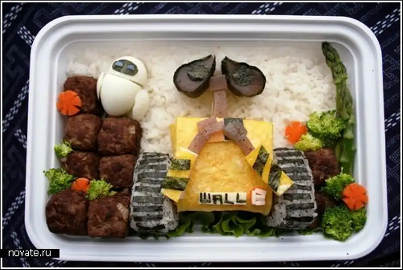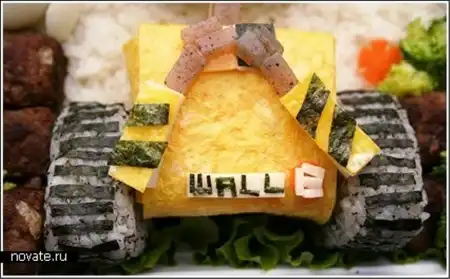 Но все не так сложно как кажется. Нужно лишь иметь необходимые продукты, воображение и нож под рукой, всего-то. Кстати, в основном, среди ее художеств мы можем найти героев мультфильмов, что очень кстати, ведь делается это для детей. Взрослые и так могут поесть, а в детей куда проще будет впихнуть рисовую кашу в виде робота Валли или пудинг из Тамагочи.