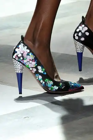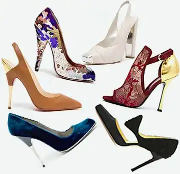 На фото: цветные туфли Miu Miu, белые туфли Christian Dior с серебристым носком, изящные туфли на золотистом каблуке Christian Louboutin, бордово-золотистые босоножки Sergio Rossi, вельветовые туфли Stella McCartney, черная классика Manolo Blahnik