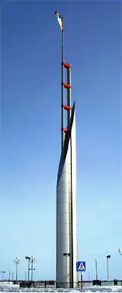 Высота стелы 48 метров. Металлоконструкция увенчана стягом в трехцветном исполнении, которые символизируют синие воды и небо Югры, белоснежные просторы Севера и золотые богатства Самотлора.