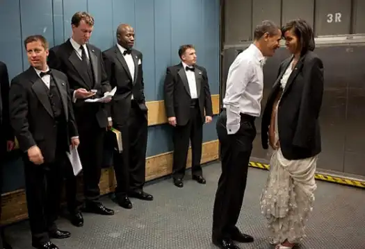 Мишель и Барак в грузовом лифте, на Мишель пиджак мужа. Они спешат на очередной инаугурационный бал.
