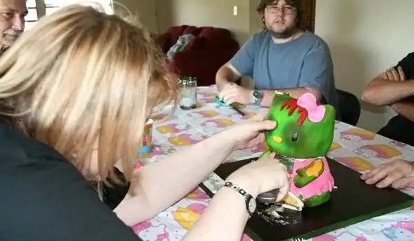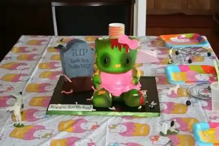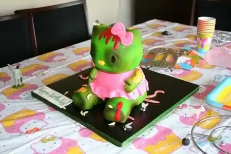 Новое поколение многоярусным тортом с розовыми рюшками не удивить, здесь нужен особенный подход. В нашем случае девочке поклоннице мультика Hello Kitty родители подарили на ДР тортик в стиле зомби, похоже ребенок остался доволен.