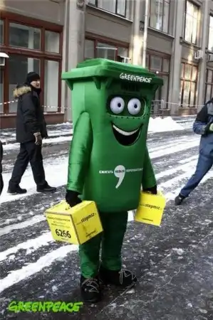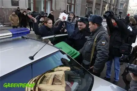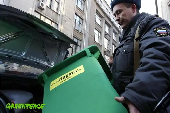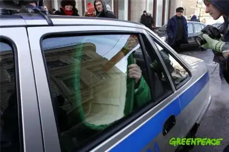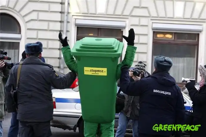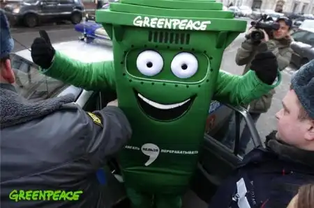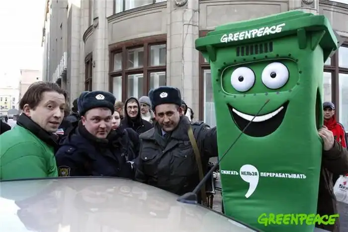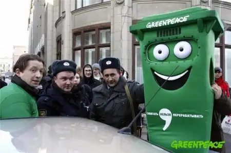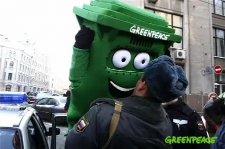 Не поверите - несчастного парня из Greenpeace, того самого, в костюме мусорки, снова загребли.