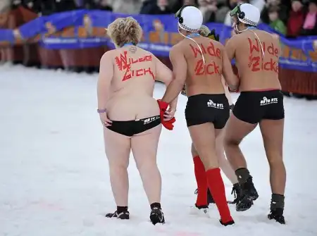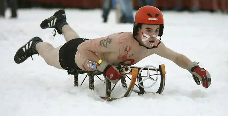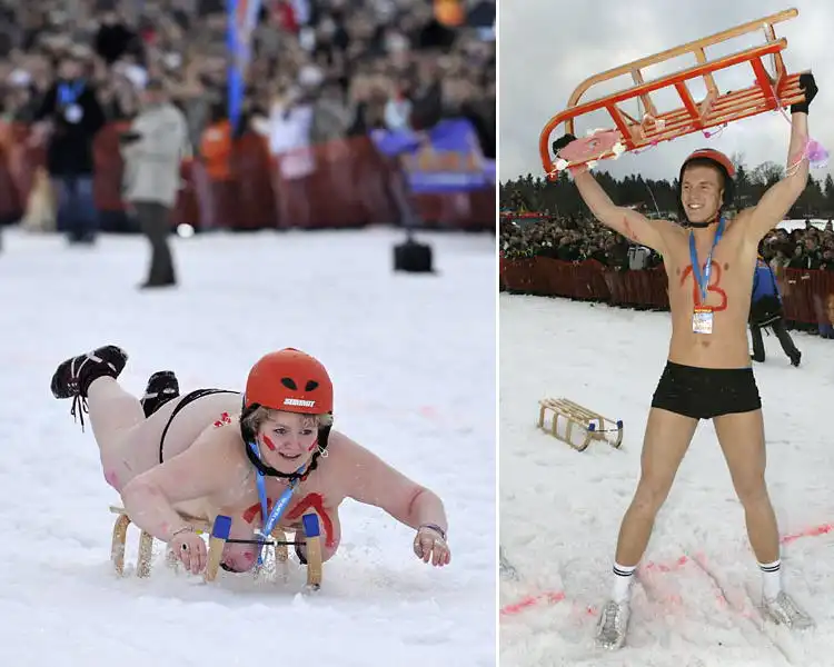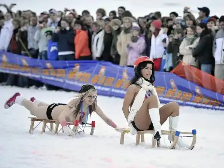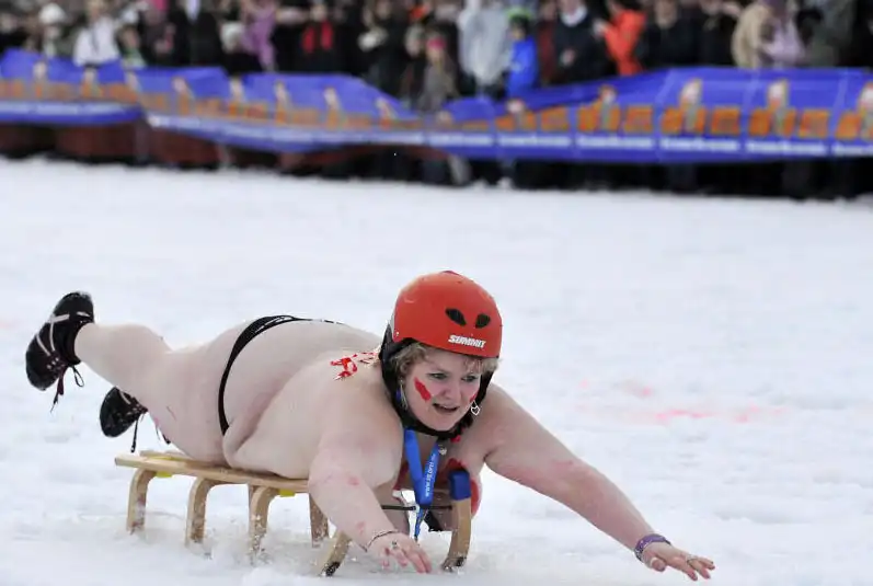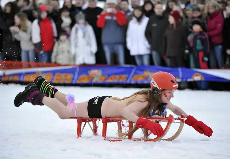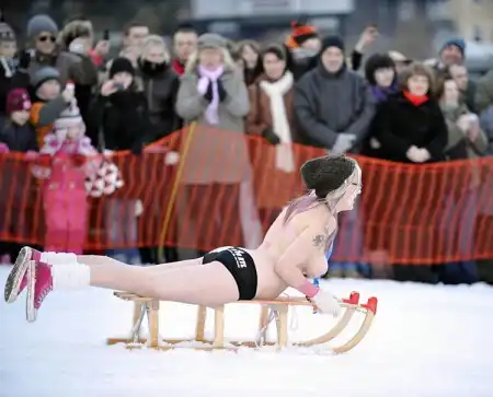 12 000 зрителей собрались в курортном городке Браунлаге, чтобы понаблюдать за соревнованиями чемпионата по катанию с горы на санках в полуголом виде.