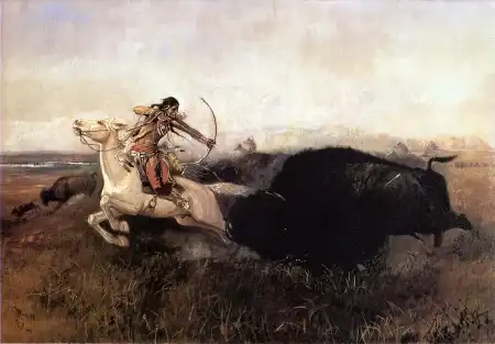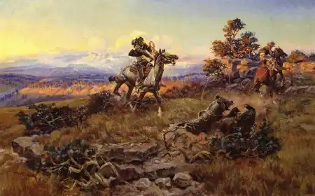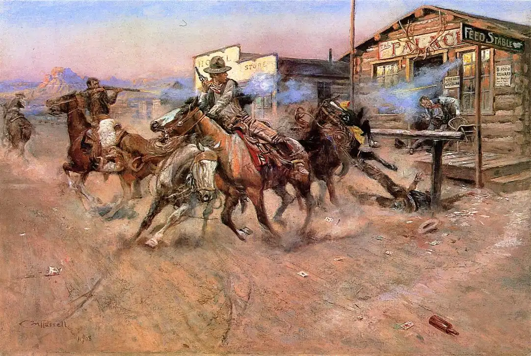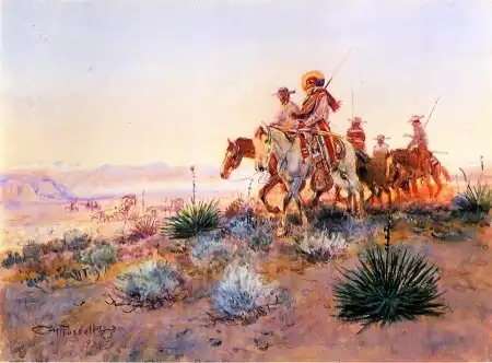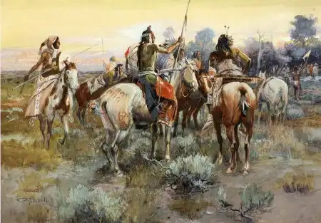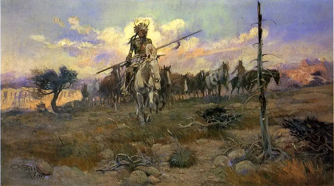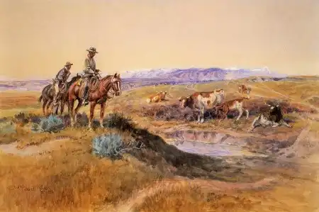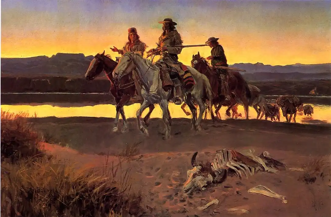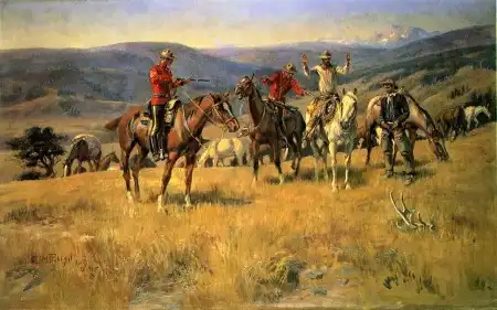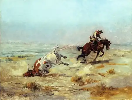 Рассел, Чарльз Марион, 1864-1926, американский художник . Он был одним из двух величайших и самых популярных художников американского Запада .Первый заработал себе на жизнь, как охотник, ставящий капканы и ковбоем, а затем стал переводить свою страсть к приключениям и американской дикой природы на холст для собственного развлечения. Работы наполнены движением ковбоев, коренных американцев (с которыми он проживал в течение периода времени), и галопирующей лошади.