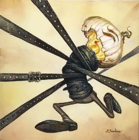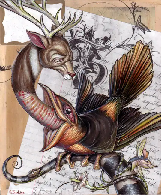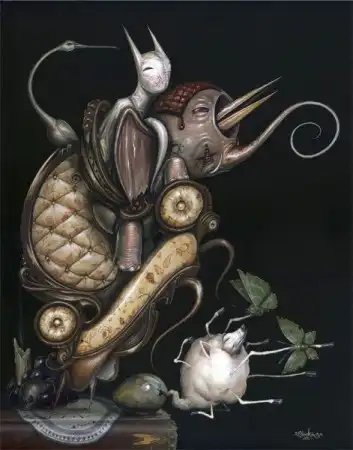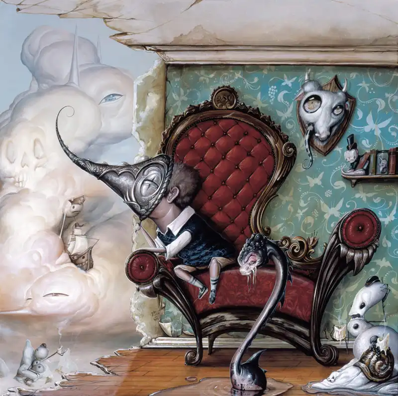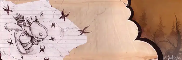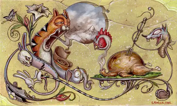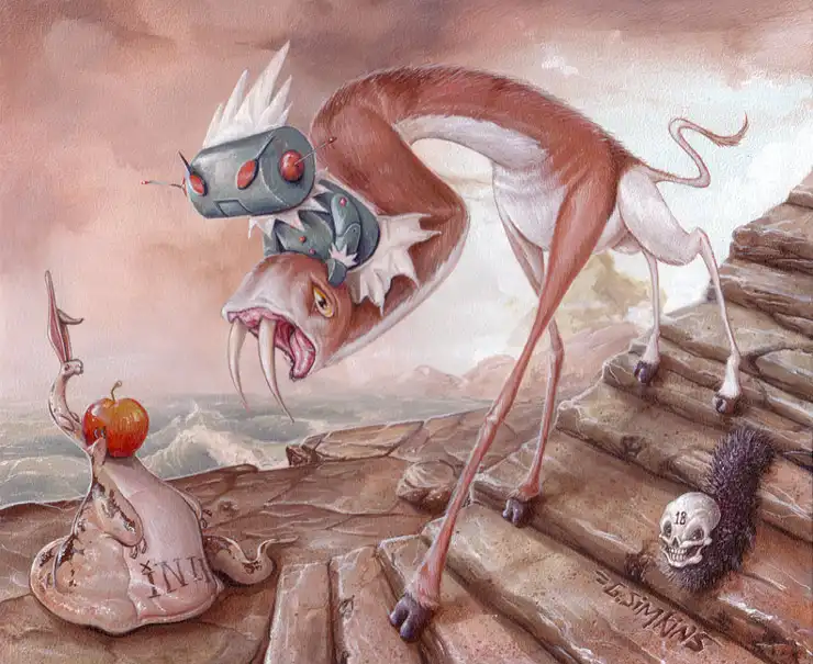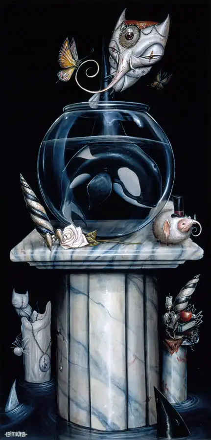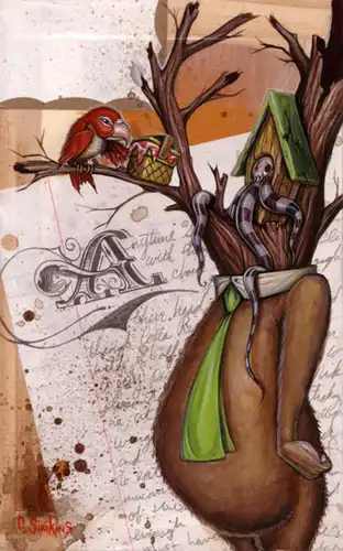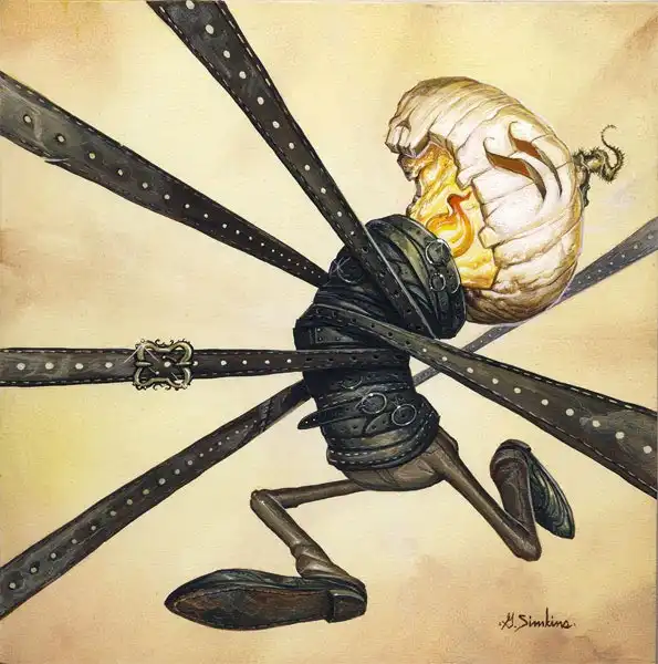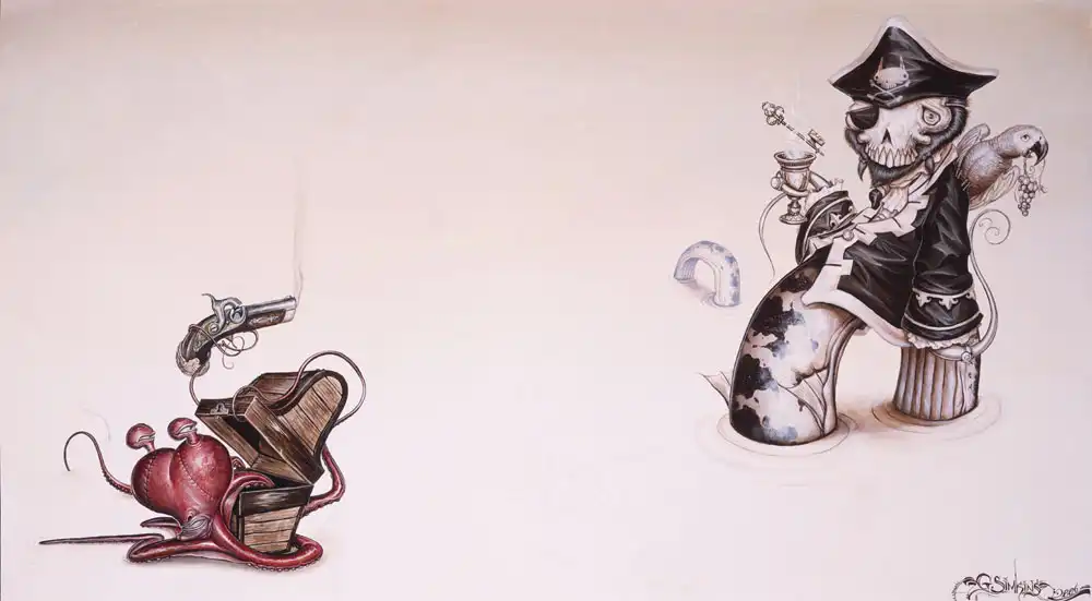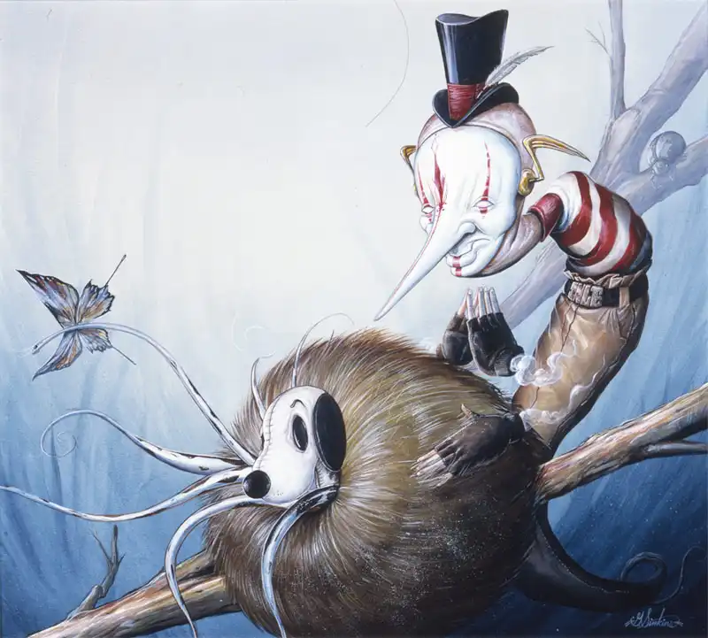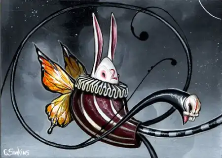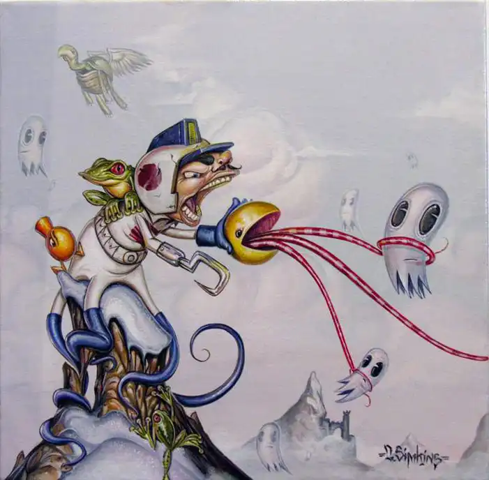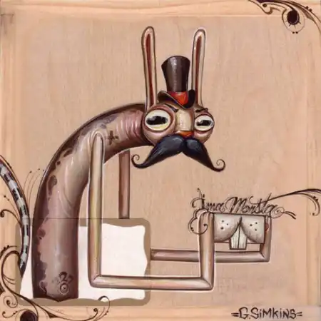 Он потратил многие годы, заполняя альбомы, разрисовывая стены и наконец нашел путь перенести их на холст. Интермедия фантазии, диковинного - то, с чем Вы сталкиваетесь в каждой работе Симкинса, вдохновленного элементами работ старых мастеров, природы, китча и исковерканного воображения.