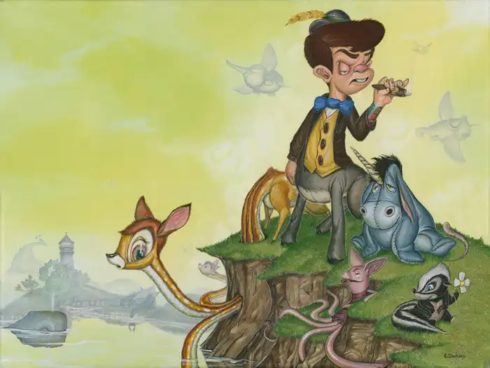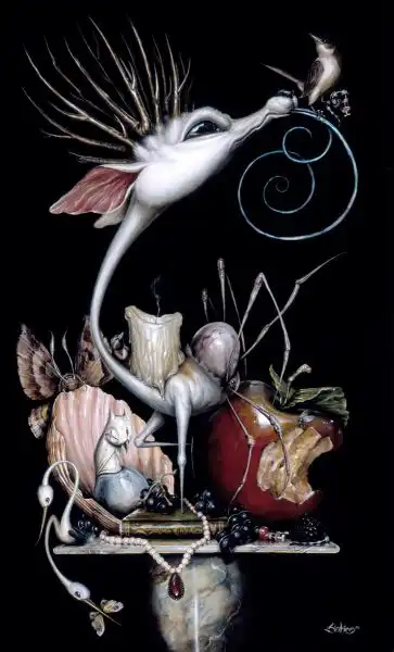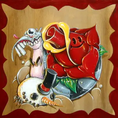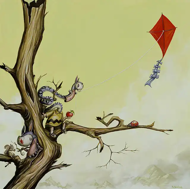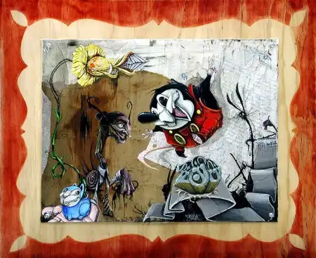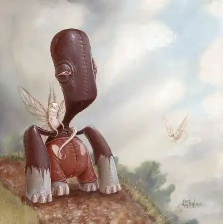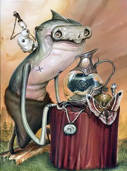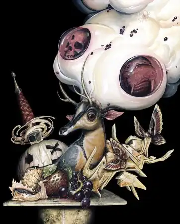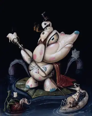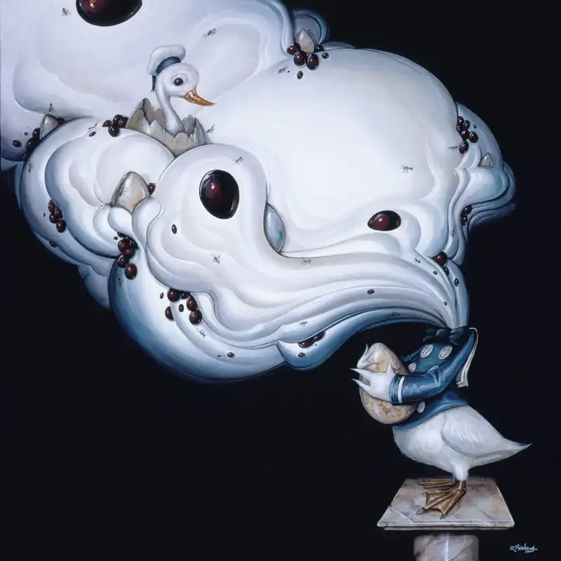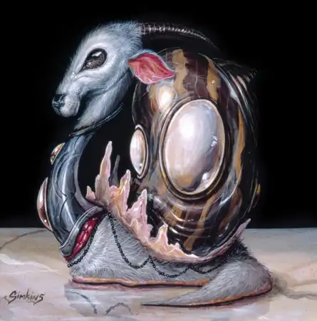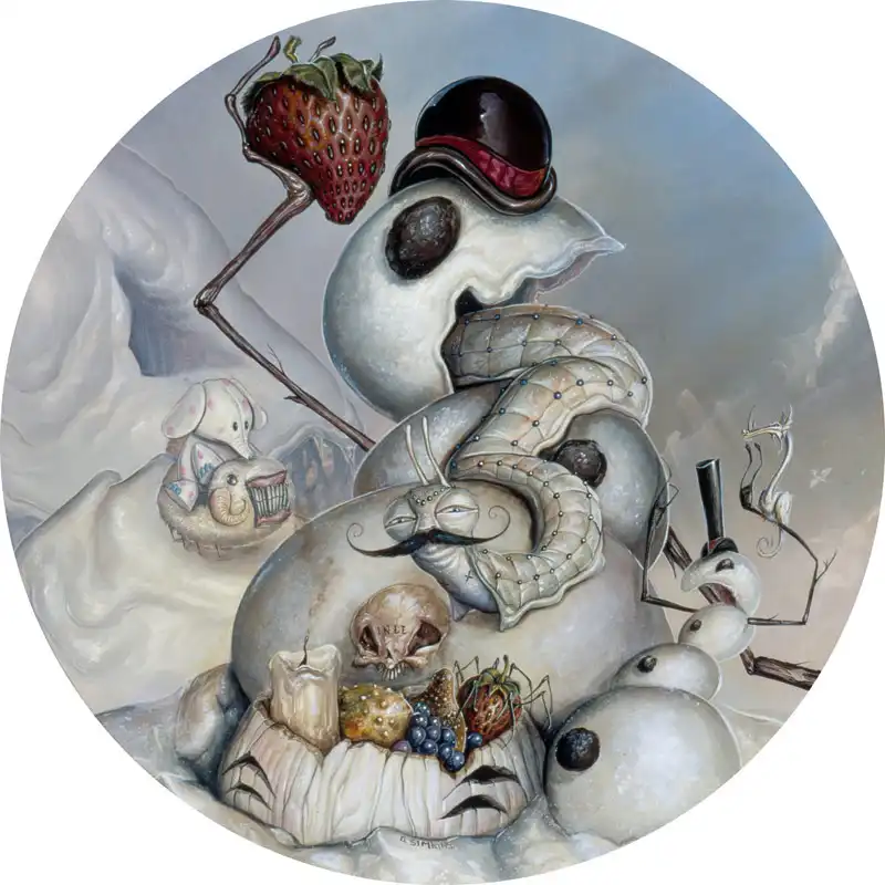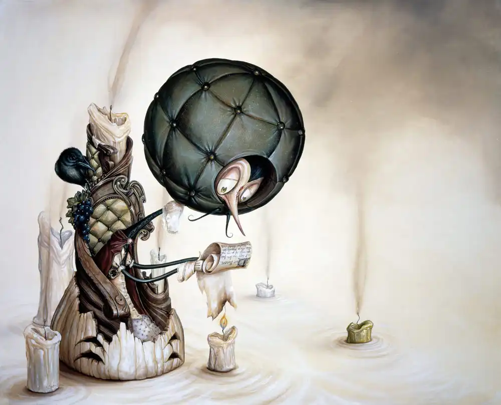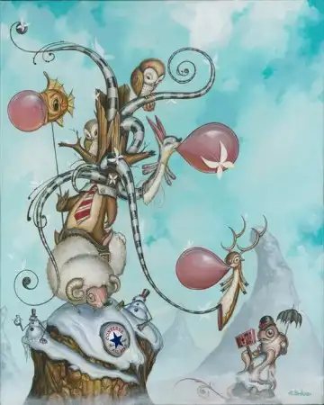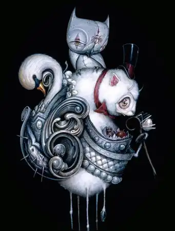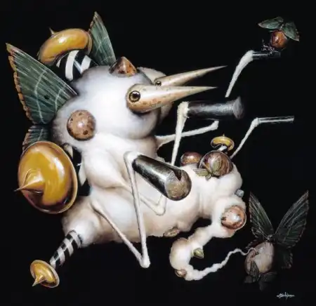 Он потратил многие годы, заполняя альбомы, разрисовывая стены и наконец нашел путь перенести их на холст. Интермедия фантазии, диковинного - то, с чем Вы сталкиваетесь в каждой работе Симкинса, вдохновленного элементами работ старых мастеров, природы, китча и исковерканного воображения.