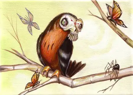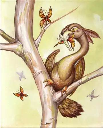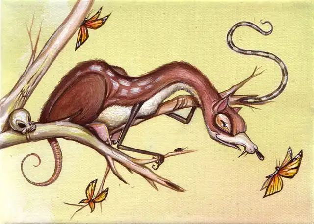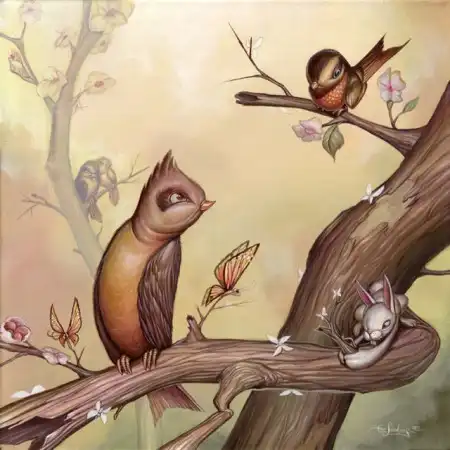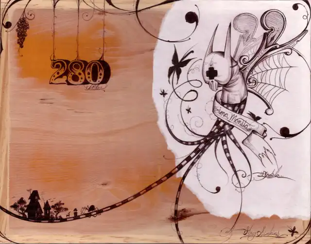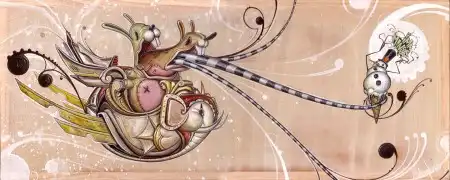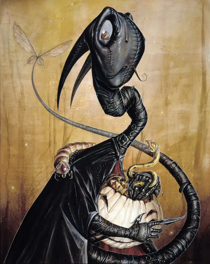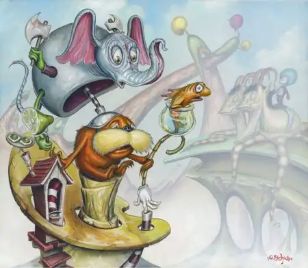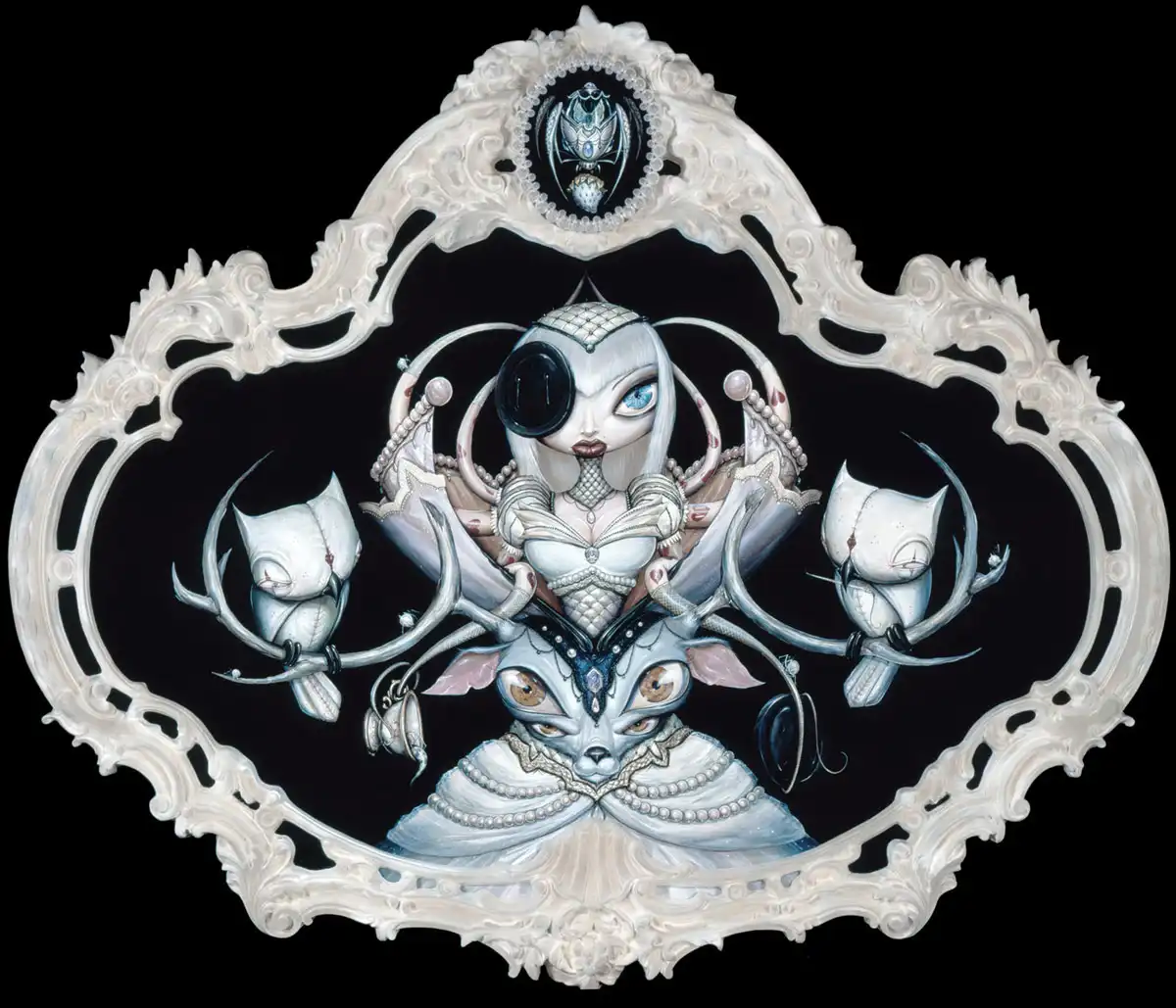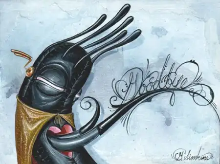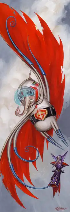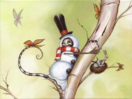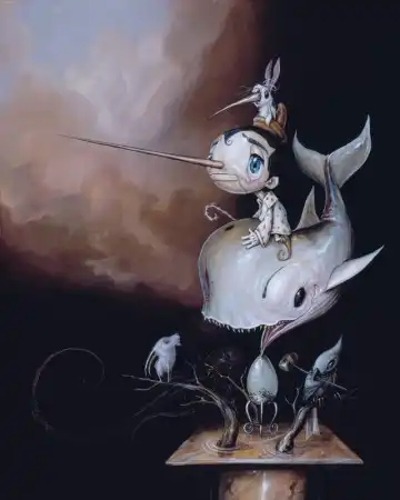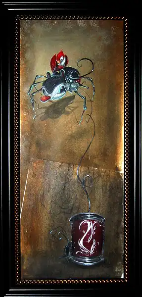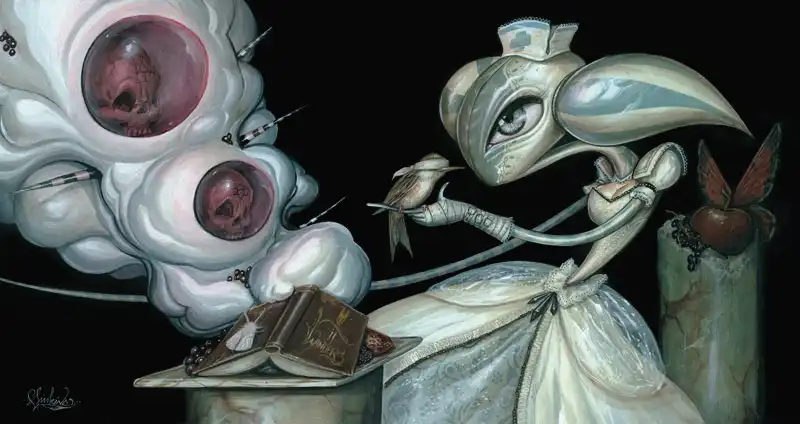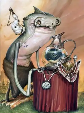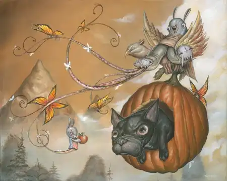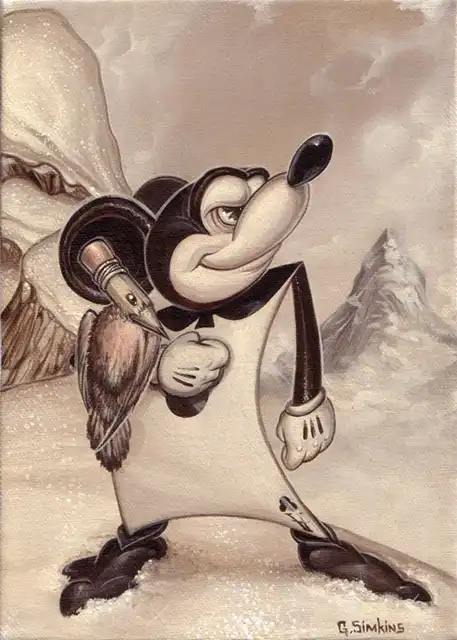 Он потратил многие годы, заполняя альбомы, разрисовывая стены и наконец нашел путь перенести их на холст. Интермедия фантазии, диковинного - то, с чем Вы сталкиваетесь в каждой работе Симкинса, вдохновленного элементами работ старых мастеров, природы, китча и исковерканного воображения.