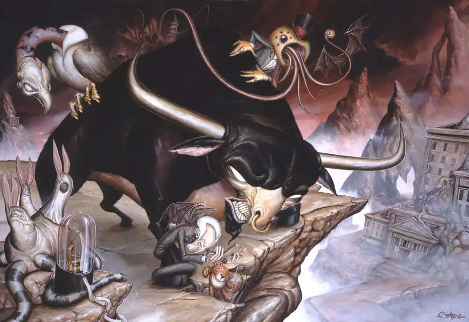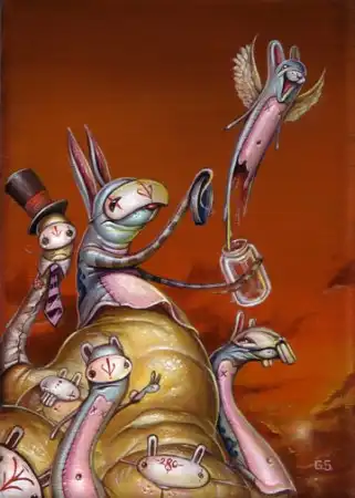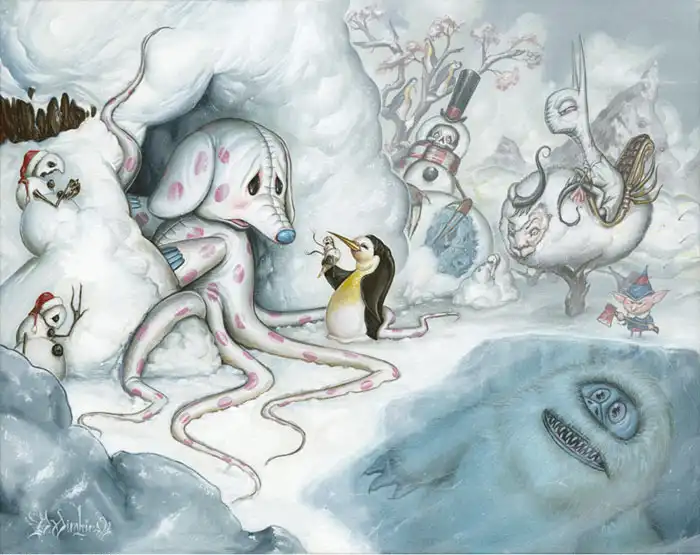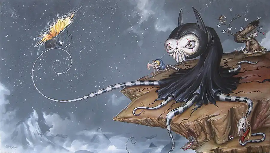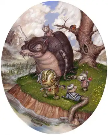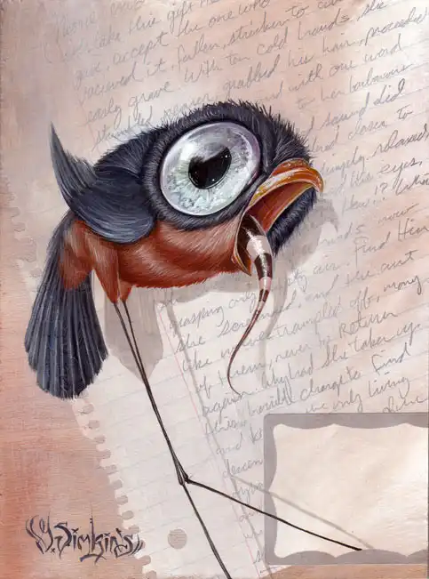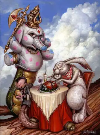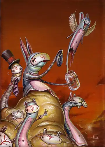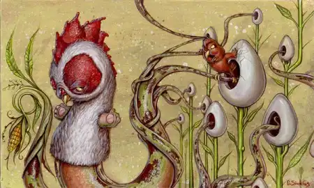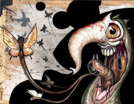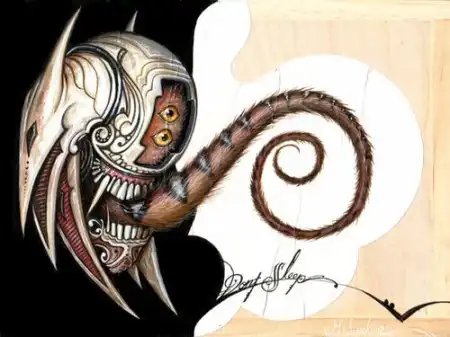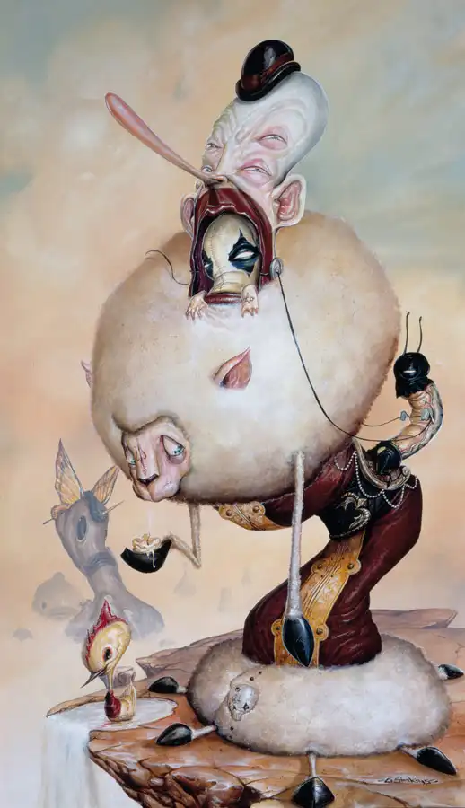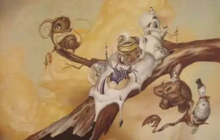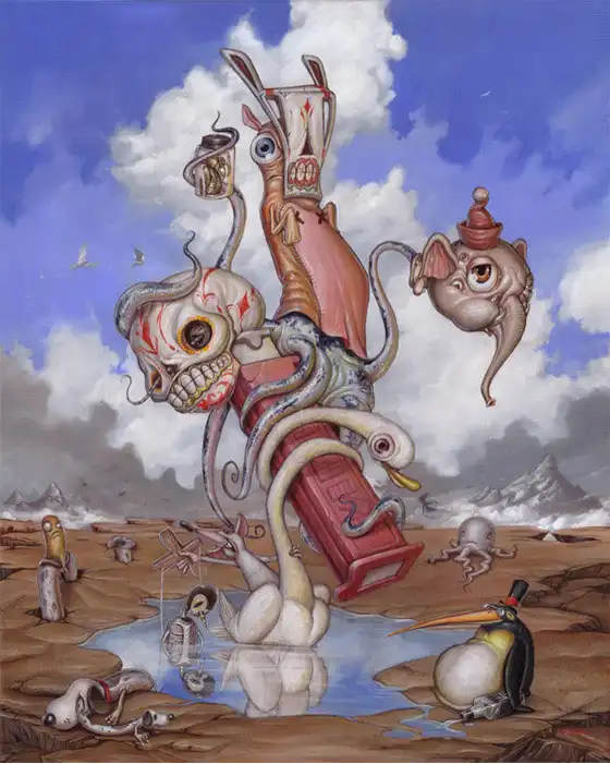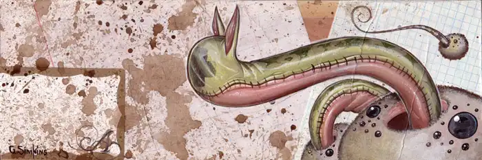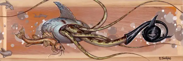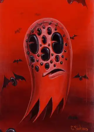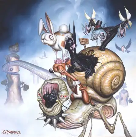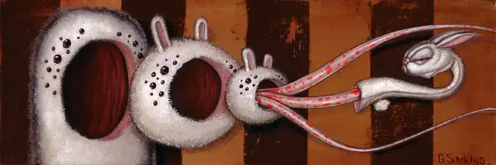 После долгих лет преследований монстров под кроватью Грэг Симкинс явился в обычный мир, принеся с собой изображения того, что он видел в тех забытых снах. Симкинс не всегда использовал кисть, чтобы показать нагромождение характеров.