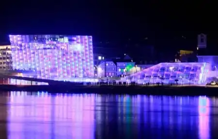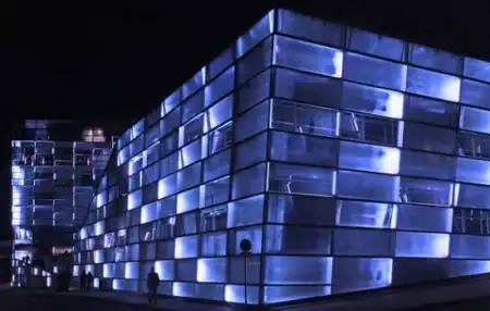 Хотел бы, чтобы проекты, подобные музею Ars Electronica из Австрии, появлялись и у нас. Более креативного и заметного здания, наверное, просто не существует. Архитектор оснастил лицевую панель здания 1085 мощными светодиодными панелями, которые мигают в такт с музыкой, звучащей вокруг здания. Естественно, мигают не все сразу панели, изменение светимости идет по определенному алгоритму, так что получается огромная цветомузыка.