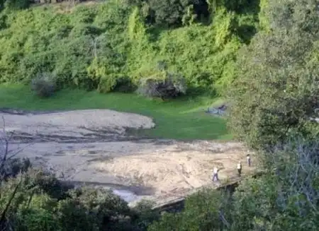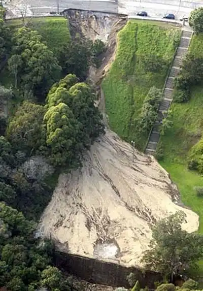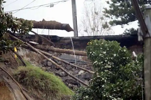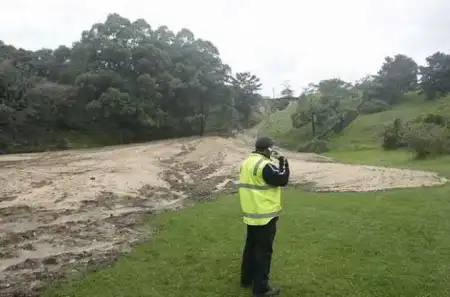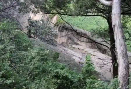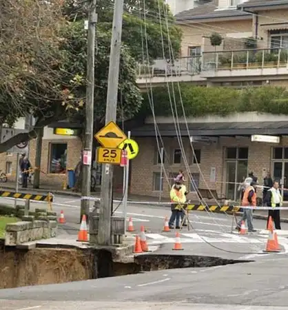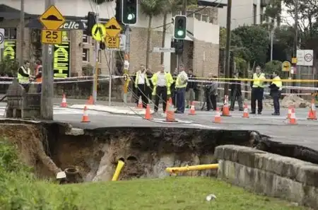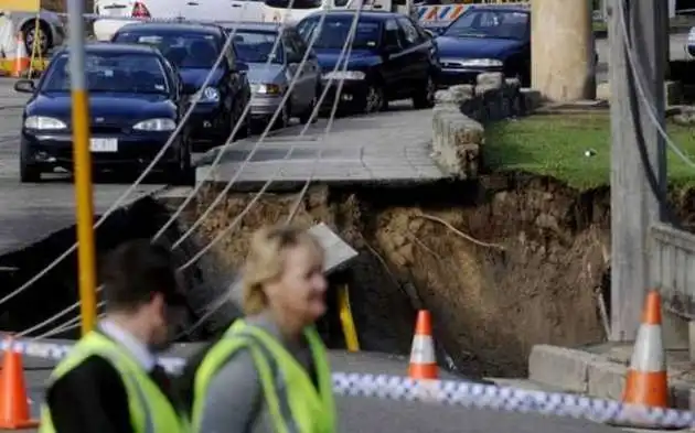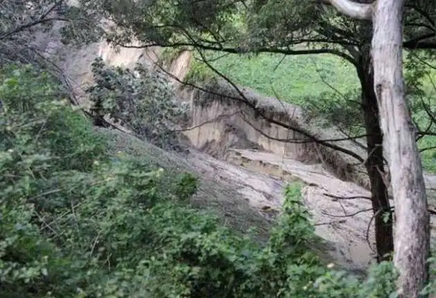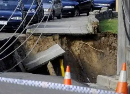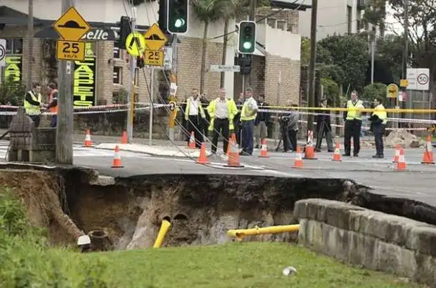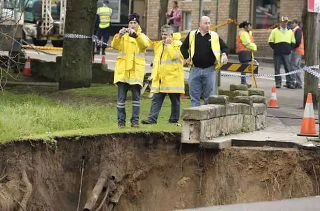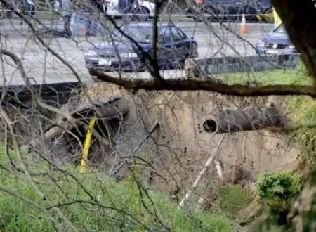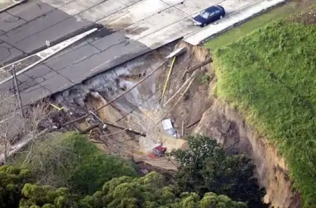 Обвал дороги произошел в результате потока воды, которая и смыла часть дороги с двумя стоящими на этом участке машинами.