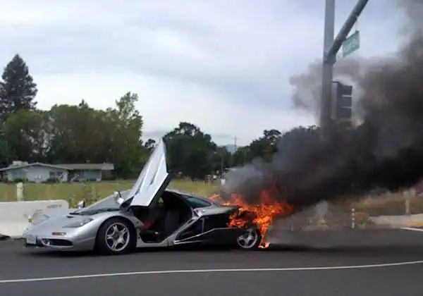 Вот в городе Санта Роcа, в Калифорнии, сгорел McLaren F1. Хозяин автомобиля спокойно ехал, когда проезжающие мимо него автомобилисты стали махать руками. Он остановился, вышел из машины и увидел, что машина горит. Пожарные, приехавшие по вызову, успели потушить огонь до того, как он уничтожил всю машину. Теперь автомобиль отправился на ремонт в Англию, так как страховая компания оценила повреждения как "Возможность полного восстановления - 90%". Машина застрахована на 2 миллиона долларов, хотя поговаривают, что ее цена была не менее 3 миллионов.