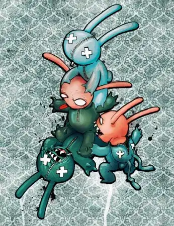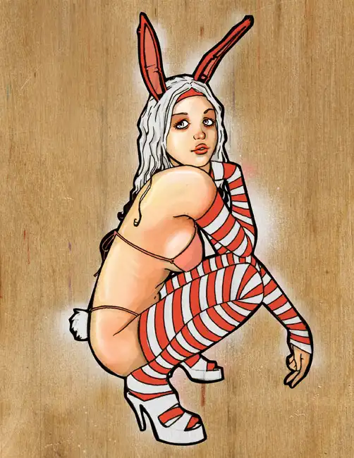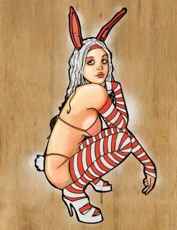 В некотором смысле, Джейсон Левеск – помойная яма, где сокровища зачастую таяться под толщами слизкой грязи, металлолома, рухляди и голубиных трупов. Увидав работы Левеска, среднестатистический человечек гневно барабанит по столу: «Да это же эстетическая пошлятина!». Пошлятины у Джейсона полно, но если быть более внимательным, схватить нож и срезать всю эту толстую шелуху, то взгляду открываются лакомые прелести: девочка, пожирающая осьминога, свирепые кролики с клыками, соблазнительные лолиты-арлекины, а также стильный человек-петух.