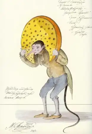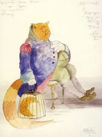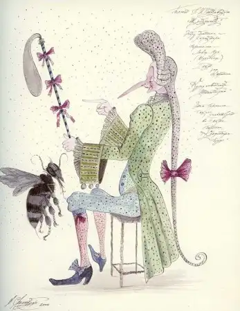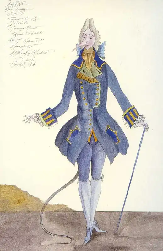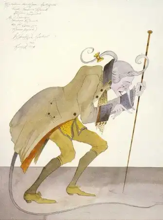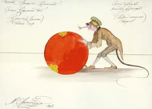 Эскиз костюма к балету С.Слонимского «Волшебный орех». Крысенок с сыром. 2002. Бумага, тушь, акварель
