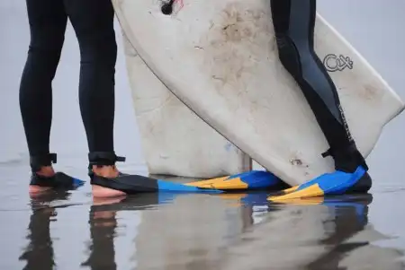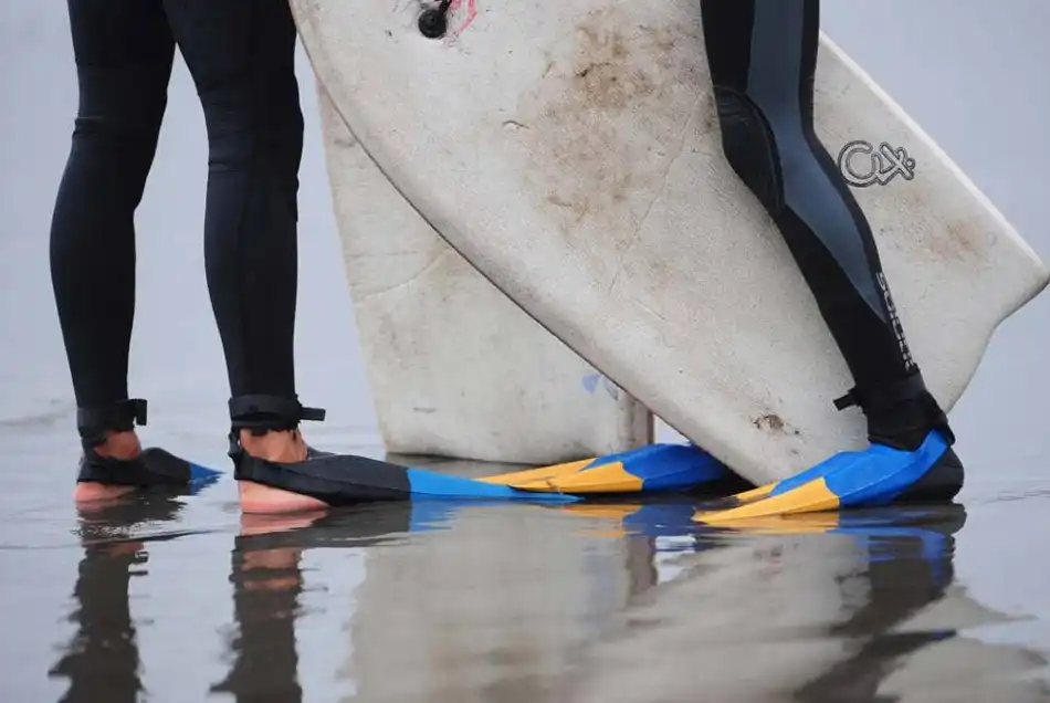 Два парня в неопреновых костюмах и ластах разговаривают во время перерыва занятий по серфингу на пляже Кон-Кон в 130 км от Сантьяго, 27 февраля 2009 года. Серфинг в Чили стал особенно популярным благодаря быстрому росту школ, обучающих детей с трех лет стоять на доске. Так как вода в море холодная (всего 12 градусов по Цельсию летом), необходимо плавать в неопреновых костюмах. Чили имеет одно из самых длинных побережий в Латинской Америке, поэтому она «приютила» у себя несколько мировых чемпионатов.