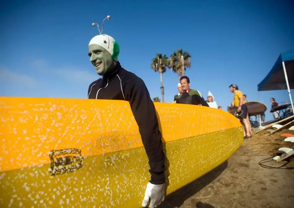 Ричард Файер из Лос-Анджелеса направляется к воде в костюме пришельца, принимая участие в седьмом ежегодном фестивале Doo Dah Surf Day на пляже Сансет Бич в Лос-Анджелесе, штат Калифорния, в субботу 25 июля 2009 года.