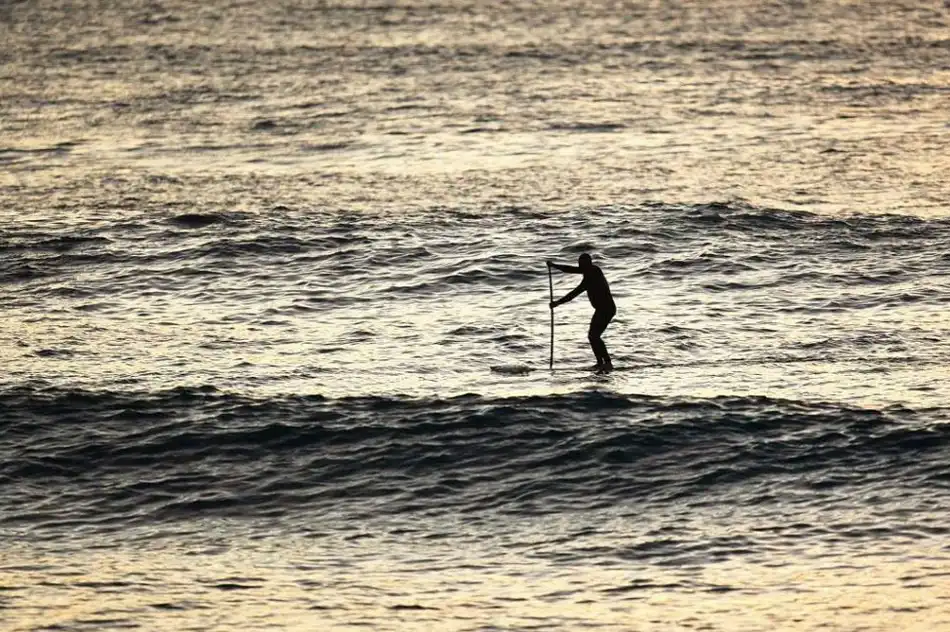Пол Хоукинс плывет по волнам на своей доске на пляже Куинсдиф 1 мая 2009 года в Сиднее, Австралия. Современный стоячий серфинг с веслом произошел на Гавайях в 1960 году, когда инструкторы по серфингу следили за своими учениками в воде. Сейчас этот вид спорта быстро набирает популярность благодаря своей пользе, которую он приносит сердечно-сосудистым органам.