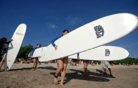 Туристы несут доски для серфинга, наслаждаясь летним солнцем на пляже Кута на Индонезийском курортном острове Бали 28 июля 2009 года.