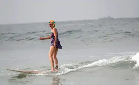 Старушка Джанет Хусден в костюме для серфинга принимает участие в седьмом ежегодном фестивале Ду Да Серф Дэй (Doo Dah Surf Day) на пляже Сансет Бич в Лос-Анджелесе 25 июля 2009 года.