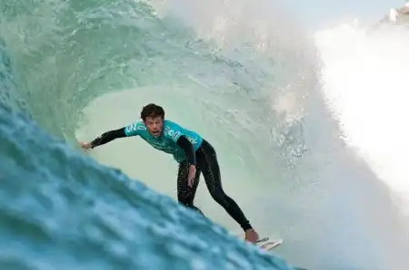 Мик Кэмпбелл из Австралии плывет под волной вечером во время второго раунда конкурса « Billabong Pro» 14 июля 2009 года в Джефрис Бэй, Южная Африка.