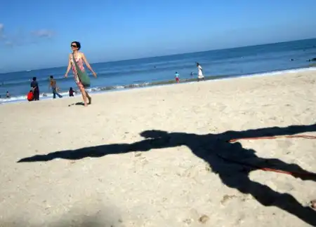 Тень туриста, несущего доску для серфинга на пляже Кута, в то время как другие туристы наслаждаются солнцем, пока жители острова голосуют в центре на острове Бали в июле 2009 года. Индонезия провела свои вторые президентские выборы с момента падения диктаторства Сухарто, и бывший генерал Сусило Бамбанг Юдхойоно был выбран на второй срок.