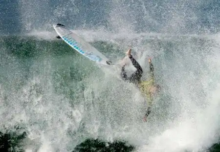 Легенда серфинга Келли Слэйтер из США в четверть финале перед поражением от Адриано де Суза из Бразилии на открытом чемпионате по серфингу на пляже Хантингтон в Оранж Каунти, штат Калифорния, 26 июля 2009 года. Местный парень Бретт Симпсон забрал первый приз в 100 000 долларов, победив австралийца Мика Фаннинга в финале, который проводился рядом с историческим пирсом Хантингтон.