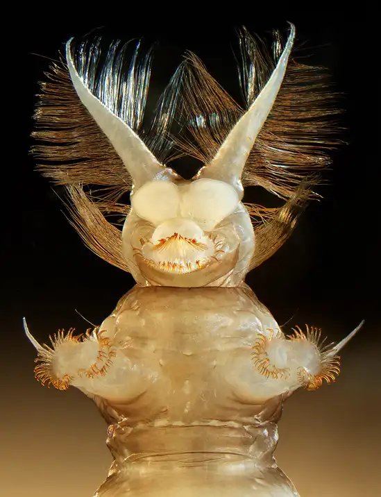9) © Фабрис Парэ, DIREN Нормандия, Эрувиль-Сан-Клер, Франция. Водная личинка ибисовой мухи (Atherix ibis) (25x) Стереомикроскоп