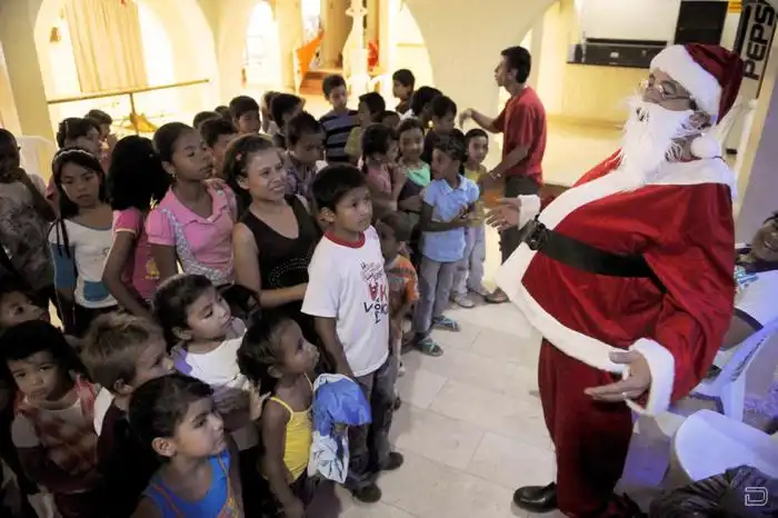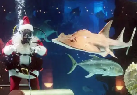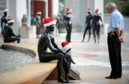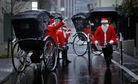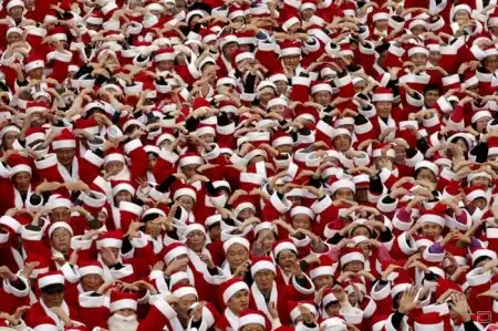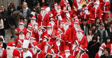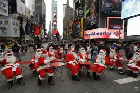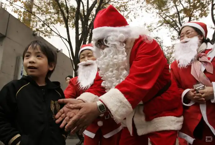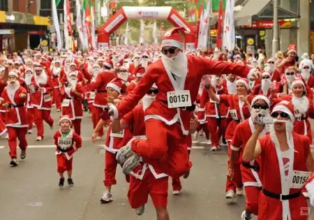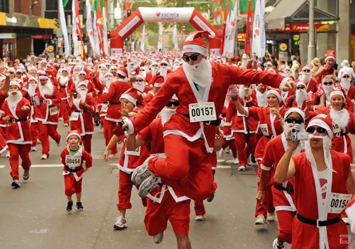 Санта Клаусы идут по миру в преддверии рождественских праздников.