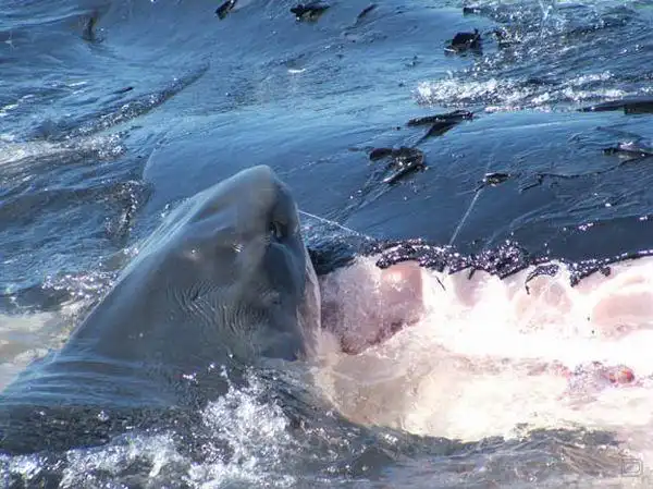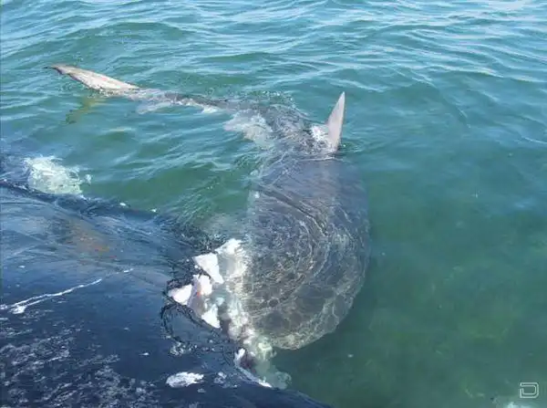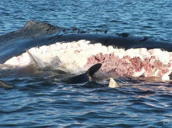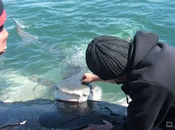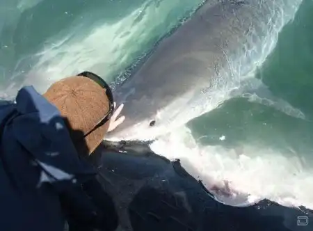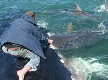 Взобравшись на мертвого кита, которого обгладывали акулы и решились погладить морского хищника - эксперимент прошел успешно.