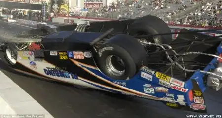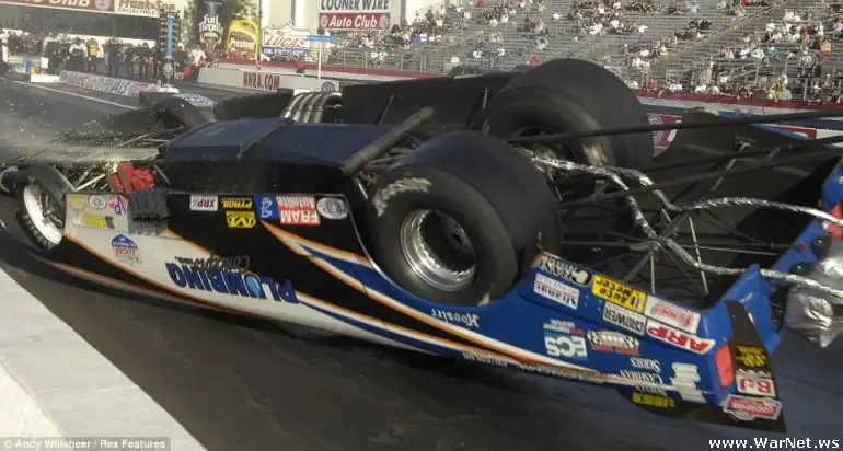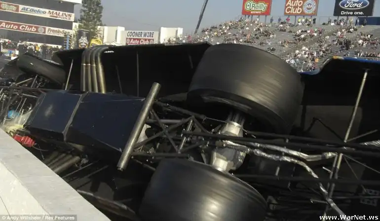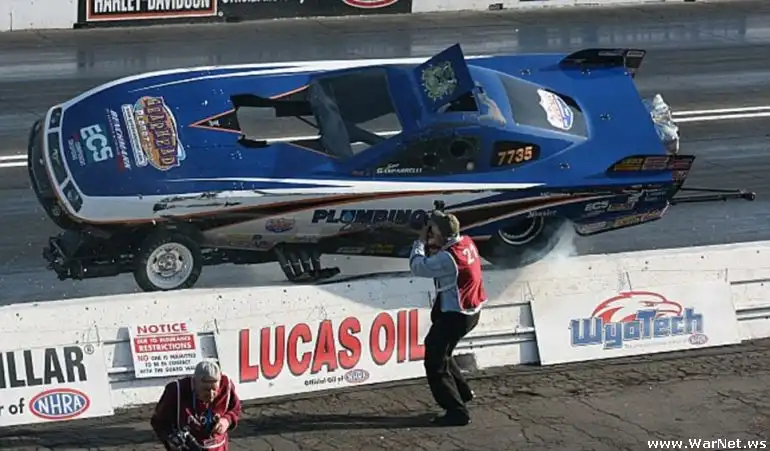 Дело было в Калифорнии. Драг-рейсинг чуть не закончился трагедией. Водитель потерял управление и чуть не вылетел за ограду, где находились журналисты. Британский журналист не стал отступать и продолжал фотографировать, даже когда машина уже почти перелетела за ограждение. А вот его фотографии.