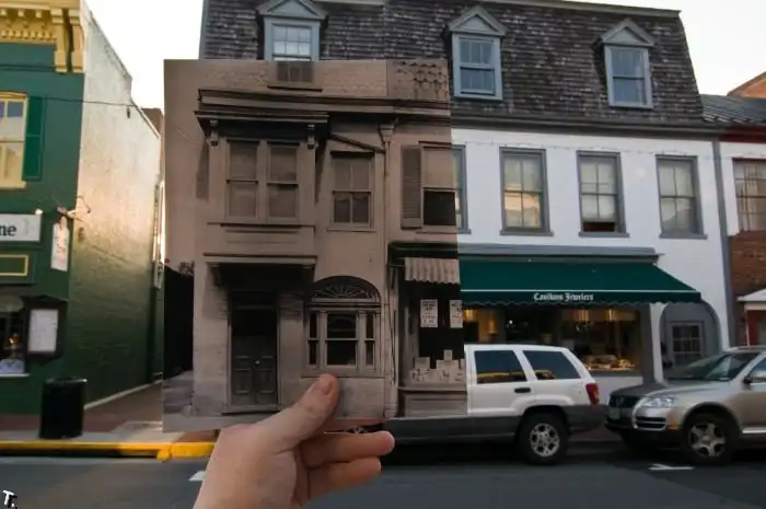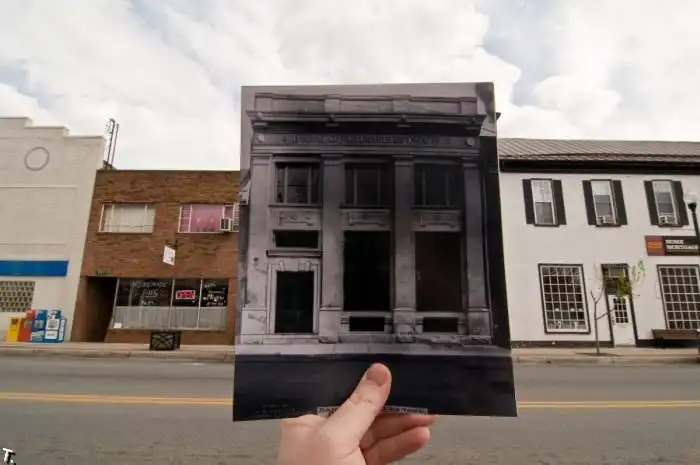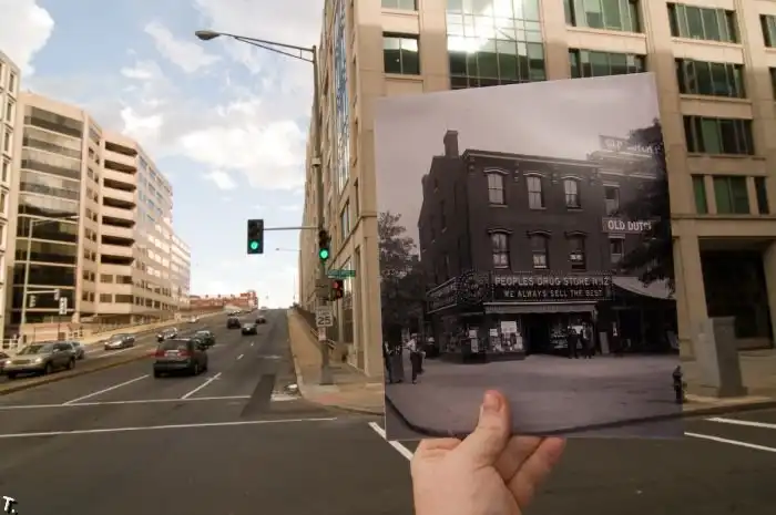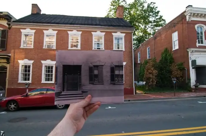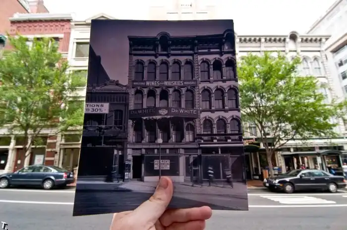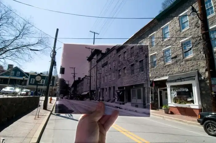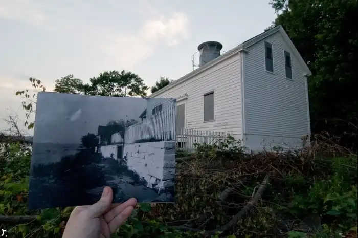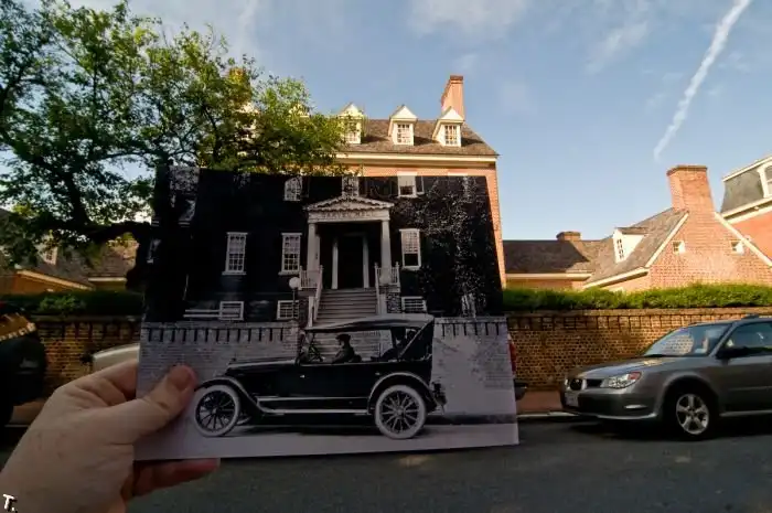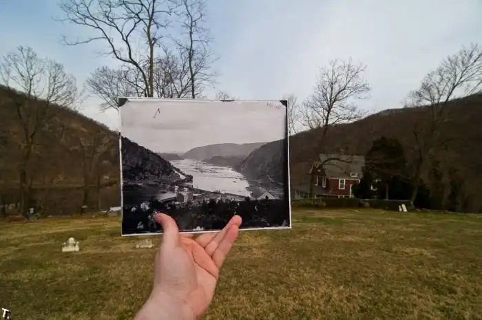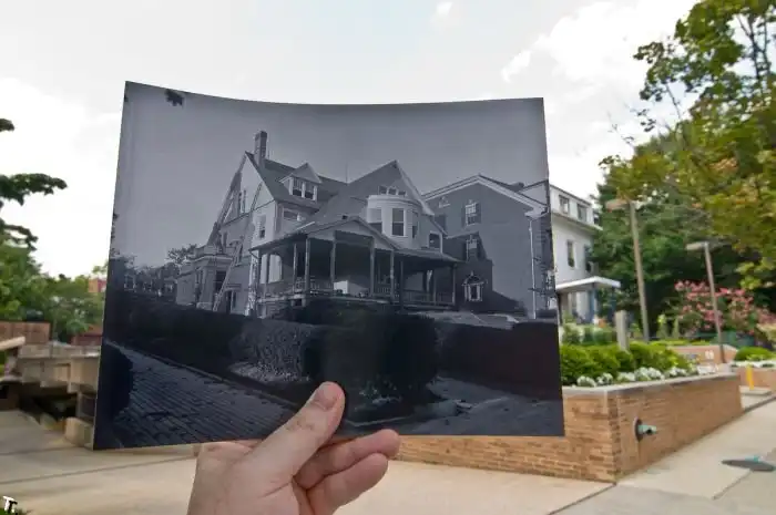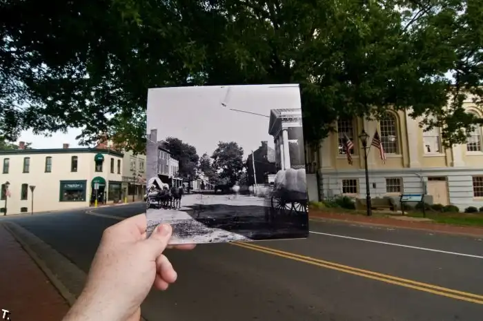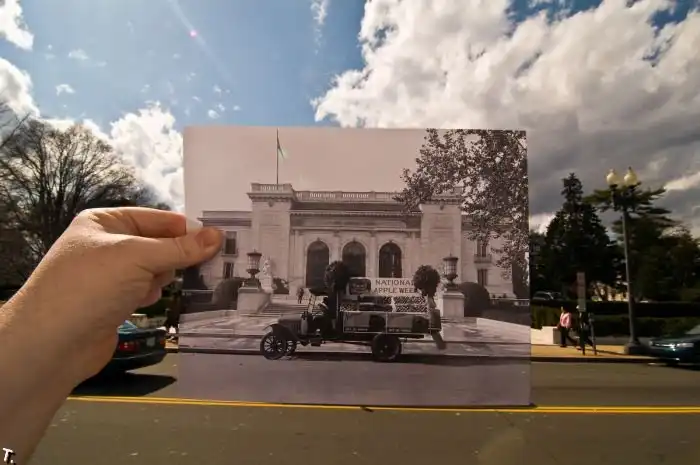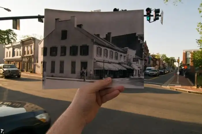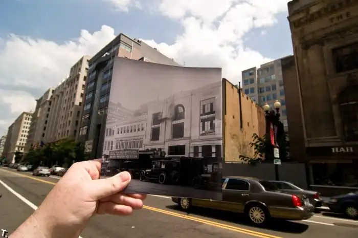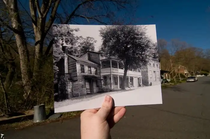 Находим старые фотографии, печатаем их, находим место, где они были сделаны и фотографируем их на фоне этого места