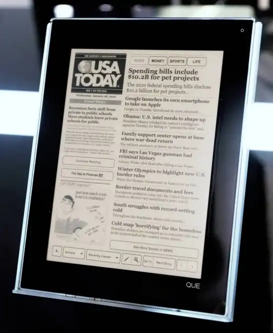 4. Устройство для чтения электронных книг «QUE» от «Plastic Logic» представляет собой небьющийся экран с параметрами 21 х 27 см, который можно использовать как для офисных документов, так и для книг. «QUE» может хранить в себе до 75 000 документов.