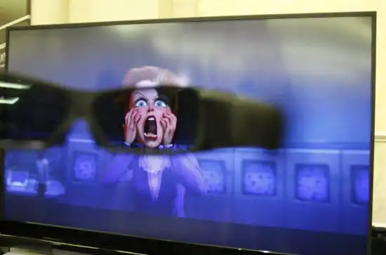 8. 3-D очки от компании «Mitsubishi» перед 82-дюймовым домашним кинотеатром с технологией 3-D-Ready на выставке CES.