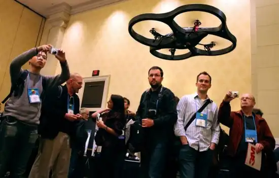 9. Посетители выставки CES смотрят на управляемую iPhone’ом летающую камеру «Parrot Air Drone» на пресс-конференции 5 января. Компания представляет свой продукт «Drone», как «убийственное приложение» для дополненной реальности.