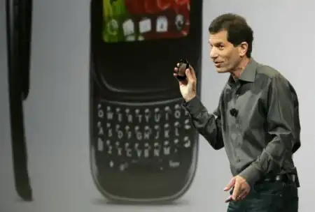 5. Джон Рубинштейн – председатель и исполнительный директор компании «Palm» - держит новый телефон Palm Pixi Plus на пресс-конференции на выставке. Компания также представила телефон Palm Pre Plus. Оба телефона поступят в продажу 25 января.
