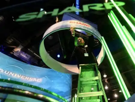 10. Джек Хора заканчивает подготовку продукта «Sharp Multimedia Lounge» внутри стенда компании «NBC Universal» 6 января. Крупнейшая в мире выставка технологий CES стартовала 7 января и продлится до 10 января.