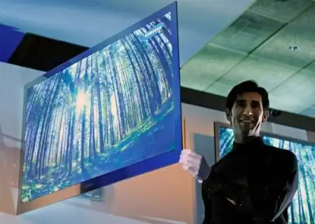 14. Сотрудник держит карандаш рядом с новым телевизором LED 9000 от компании «Samsung», чтобы продемонстрировать его толщину. Снимок сделан на пресс-конференции 6 января. Телевизор имеет встроенную технологию 3-D и процессор, который может на лету переводить 2-D в 3-D