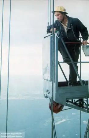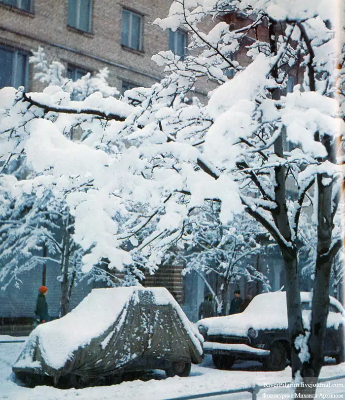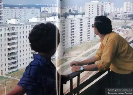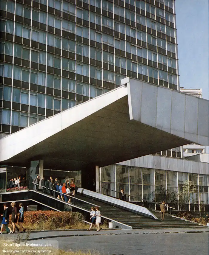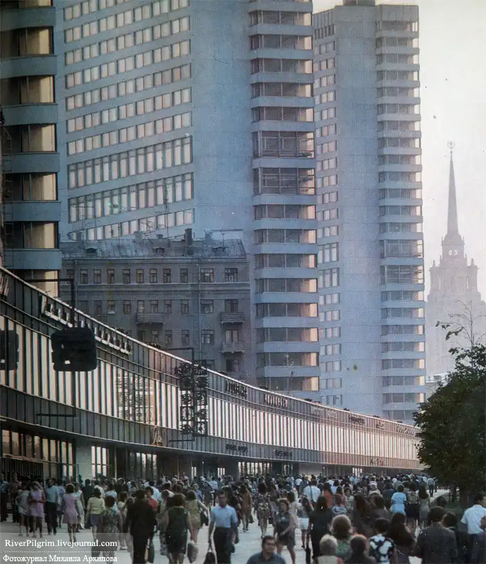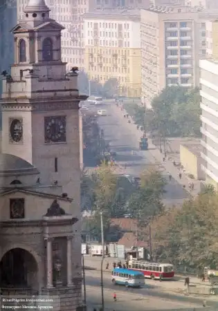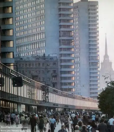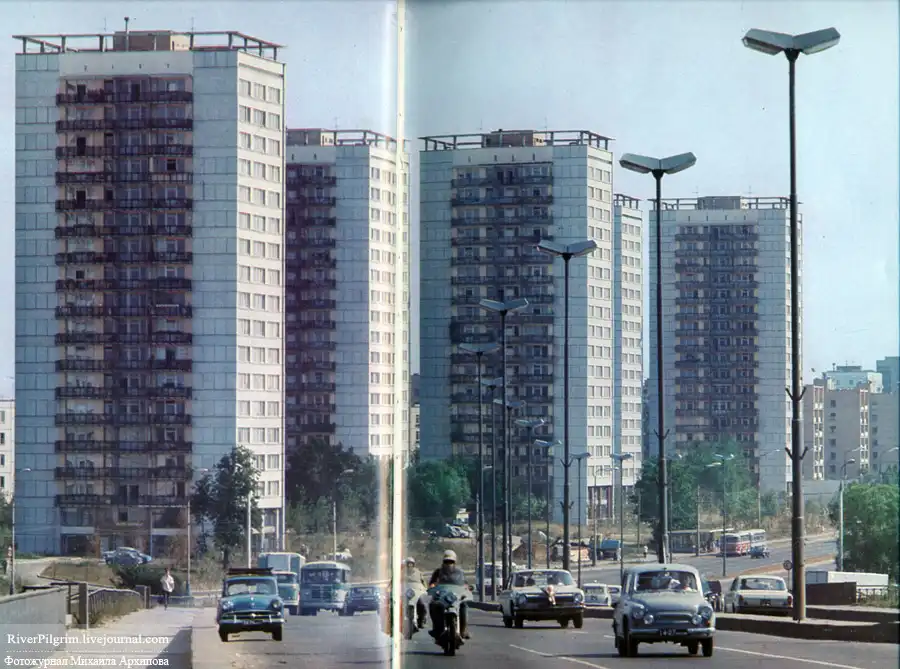 Вид на Москву со здания Министрества иностранных дел на Смоленской площади. Слева и справа - гостиницы "Белград-1" и "Белград-2", в центре Бородинский мост ведущий к Киевскому вокзалу.