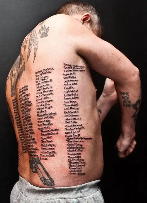 Британский военнослужащий Шон Кларк, на своей спине и груди, сделал татуировки имен 223 сослуживцев, погибших в Афганистане. Более 4-х часов потребовалось татуировщику на выполнение этой работы.