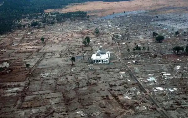 5) Мечеть – единственное здание, которое не было разрушено в прибрежном поселке недалеко от Ачеха, Суматра, Индонезия, 4 января 2004 года. Вертолеты США и моряки с авианосца «Авраам Линкольн» предоставили гуманитарную помощь после цунами, ударившего по Юго-Восточной Азии. (UPI Photo/Jacob Kirk/Navy)