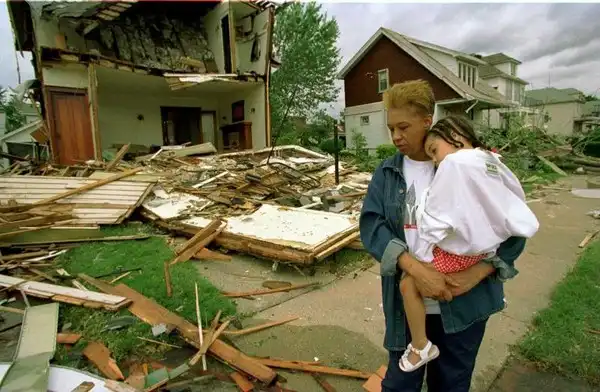 17) 3 июля 1997 года жительница Детройта Барбара Куинн держит свою 3-летнюю племянницу Тэйлор Джеймсон, осматривая соседний дом, сметенный торнадо. (UPI/bp/Bill Pugliano)