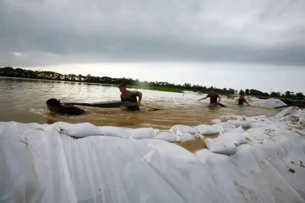 16) Американские морпехи и моряки тащат шланг по Уайт Ривер в Элноре, штат Индиана, 9 июня 2008 года. Члены 26-ого экспедиционного отряда национальной гвардии Индианы помогали властям и местным жителям поднять дамбу реки, чтобы предотвратить дальнейшее затопление района. (UPI Photo/Patrick M. Johnson-Campbell/U.S. Marine Corps)