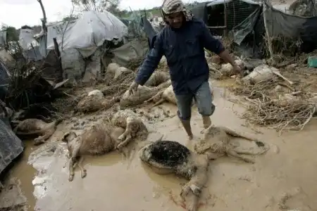 9) Палестинец проверяет мертвых овец в затопленном районе в центре Сектора Газа после сильных ливней 19 января 2010 года. Вышедшая из берегов вода затопила около 40 домов в Вади Газа – сельской местности Сектора Газа, в которой в основном проживают бедуины. (UPI/Ismael Mohamad)