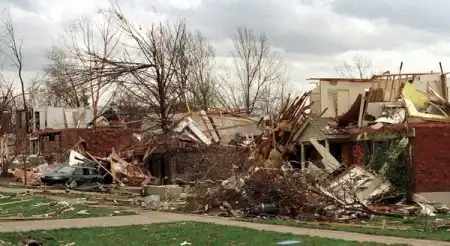 20) 9 апреля 1999 года от Блу Эш, штат Огайо, почти ничего не осталось – по городку прошелся разрушительный торнадо. Более 300 домов были уничтожены почти до основания, и еще около 100, попавшиеся на пути торнадо. (mw/Mike Williams/UPI)