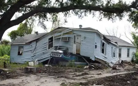 4) Дом стоит на автомобиле на улице Lower 9th Ward в Новом Орлеане 27 августа 2006 года. Спустя год после прорыва дамбы после урагана Катрина, в результате которого вода поднялась по самые крыши, город по-прежнему лежал в руинах. (UPI Photo/A.J. Sisco)
