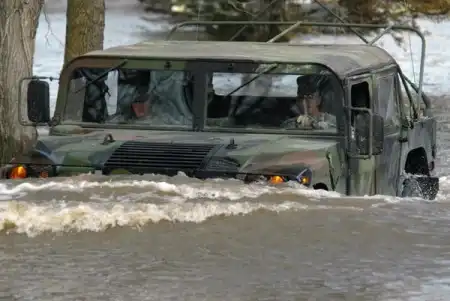 28) Штабной сержант Уильям Гриффин (справа) и специалист Джессика Сэндберг едут на автомобиле «Humvee» по затопленной улице в Форт Рэнсом, штат Северная Дакота, 15 апреля 2009 года. (UPI Photo/David H. Lipp/U.S. Air Force)