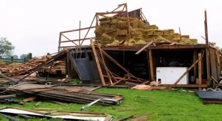 29) 4 июля 2001 года в Сайенс Хилл, штат Кентукки, торнадо вырвал с корнем деревья и сравнял с землей здания. (cc/bs/Billy Suratt/UPI)