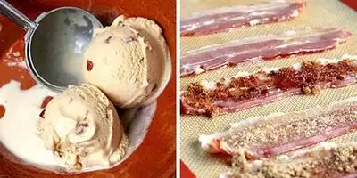 Армия любителей бекона огромна и специально для них эксперт мороженого Девид Лебовиц (Devid Lebovitz) решил доказать, что бекон годен не только для завтраков. Он создал новый сорт мороженого на основе глазированного бекона! На вид получается весьма аппетитно, а данное блюдо уже завоевало свою немалую популярность.